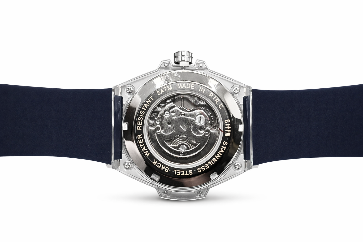 A bold statement piece with a fully transparent case that reveals the intricate skeleton movement inside. Designed for those who appreciate modern engineering and standout style, this watch pairs a crystal-clear MEABS case with a deep navy silicone strap for a clean, futuristic look. Lightweight, comfortable, and impossible to ignore.