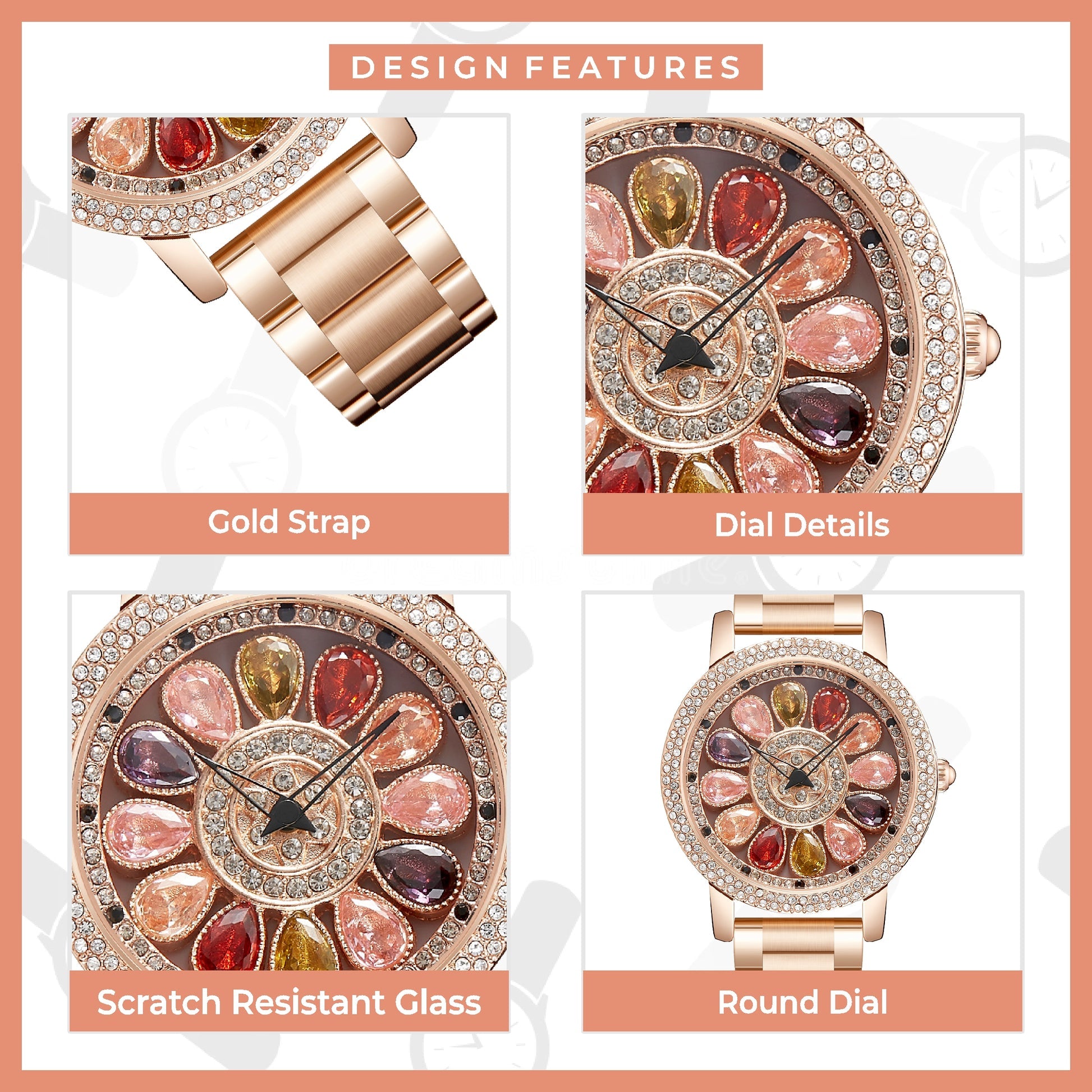 Elevate your everyday look with the Flora 360° Watch — a stunning blend of refined style and feminine charm. Featuring a rose gold round case and a multicolor diamond-studded floral dial that rotates 360°, this analog timepiece adds playful luxury to any outfit, from casual daywear to special occasions.